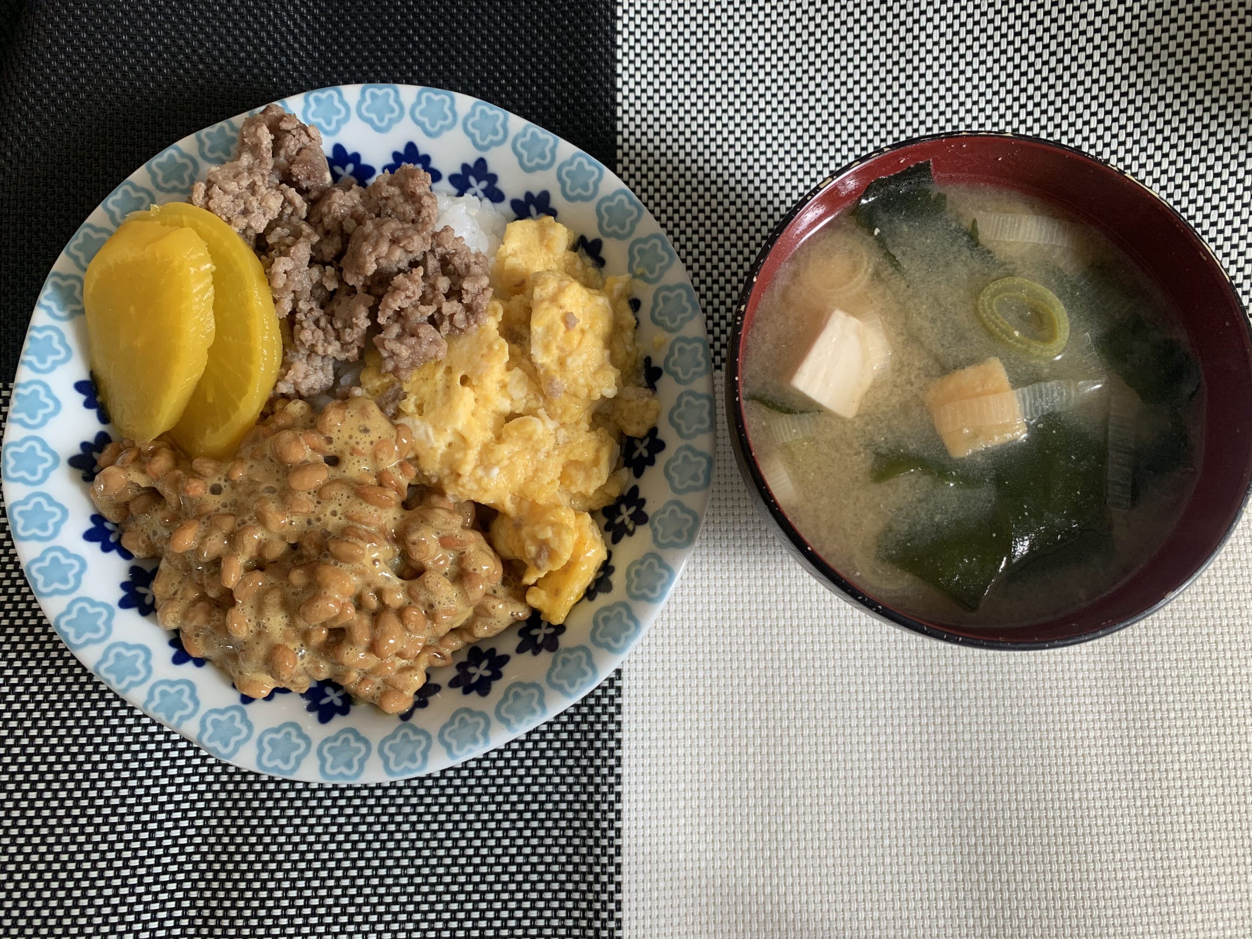 この日は前の日のそぼろ二色丼に納豆と少し豪華な丼になりました。(笑)