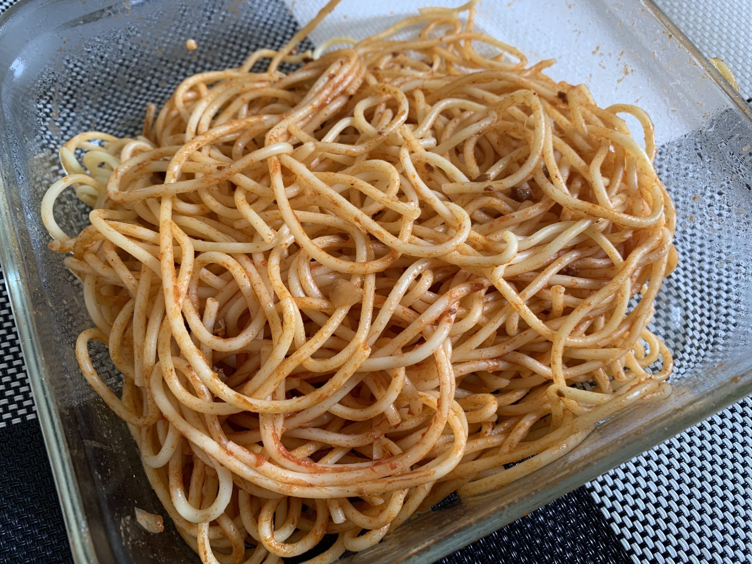 私の昼食でした。。パスタをゆでレトルトのミートソースを絡めて足りなかったので